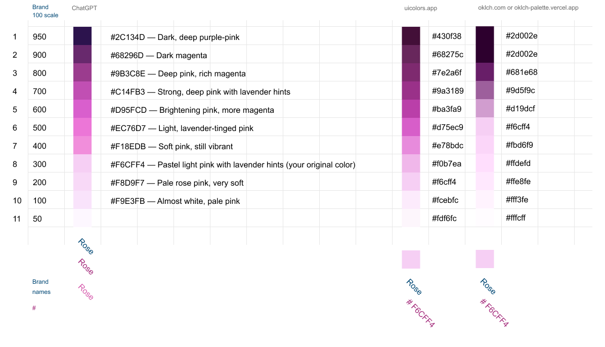 I fed an example blue scale into Chat GPT and then asked it create a similar set of swatches for my fuschia/pink colour which it did.